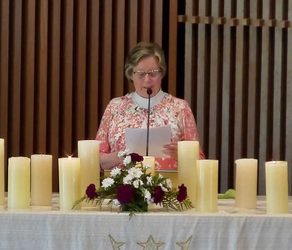 Ellen Weimer delivers a Just Peace testimonial during worship on Sunday, May 16, 2021